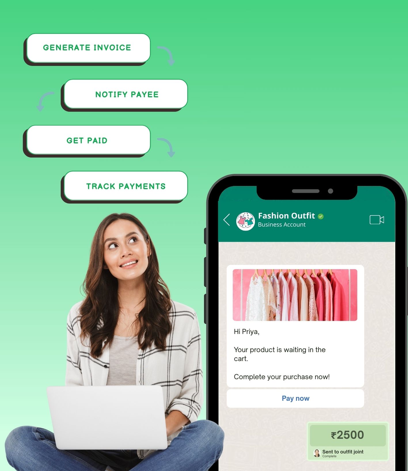 Trigger automated payment reminders on WhatsApp,Deliver safe, one-tap payment links with ease,Send invoices instantly for faster processing also Boost collections with smooth, end-to-end payments.